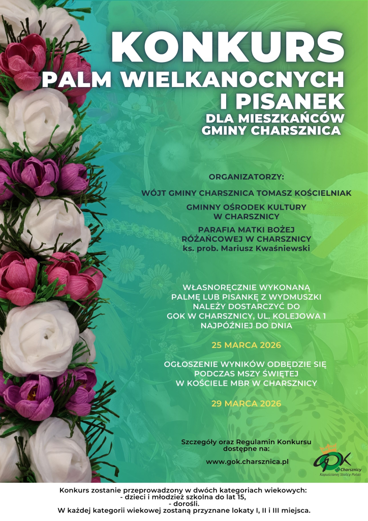 wykonaną własnoręcznie palmę lub pisankę należy dostarczyć do Gminnego Ośrodka Kultury w Charsznicy, ul. Kolejowa 1 najpóźniej do dnia 25 marca 2026 roku do godz. 15:30 ,