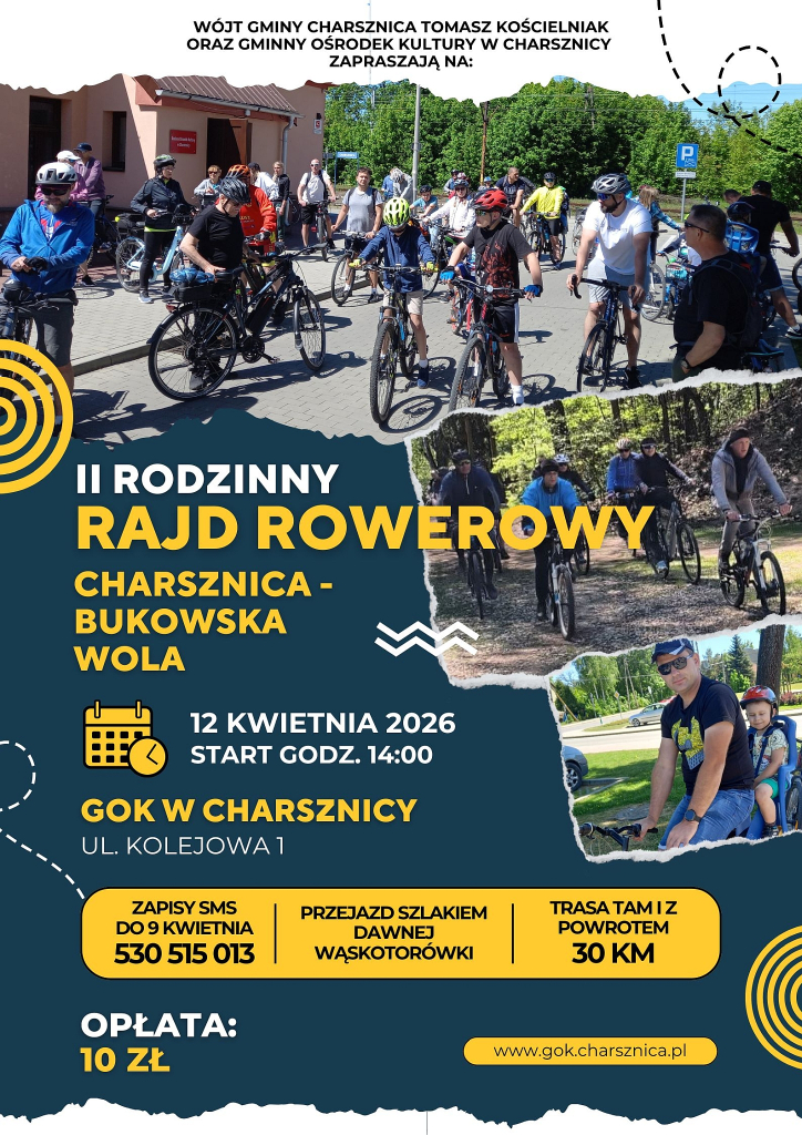 II Rodzinny Rajd Rowerowy „SZLAKIEM DAWNEJ WĄSKOTORÓWKI” zwany dalej Rajdem, jest skierowany dla pasjonatów turystyki rowerowej w każdym wieku. Odbędzie się w niedzielę 12 kwietnia 2026 roku, na trasie Charsznica-Bukowska Wola-Charsznica o dł. 30 km. Wyjazd godz. 14:00.